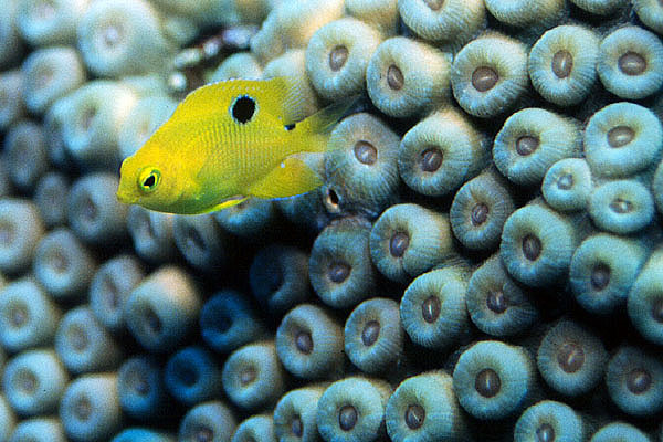 The mystery fish is a cocoa damselfish, identified by a spot at the base of the tail.