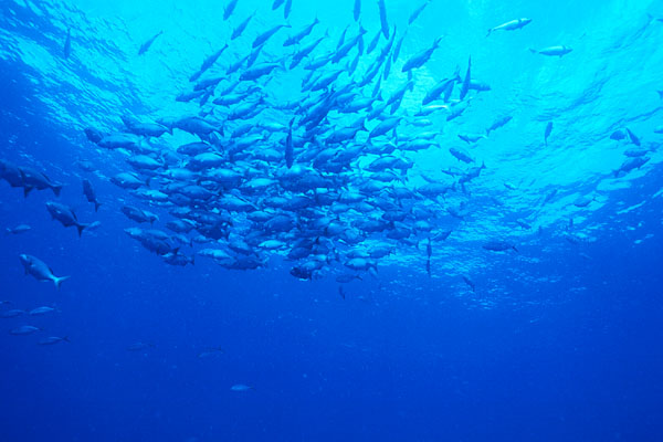 of zillions of tiny silvery fish, along with another school of fish which looked like