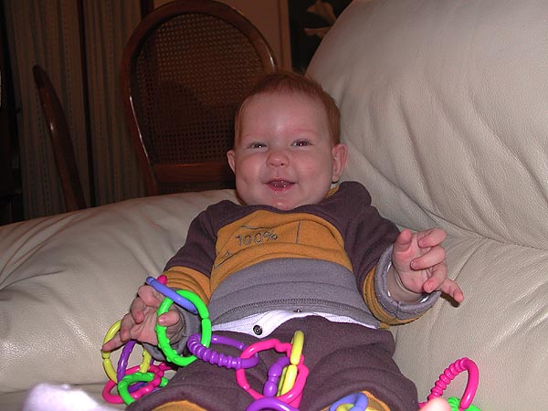 Kyle beams a huge smile from Grandma's sofa. Christmas 2002
