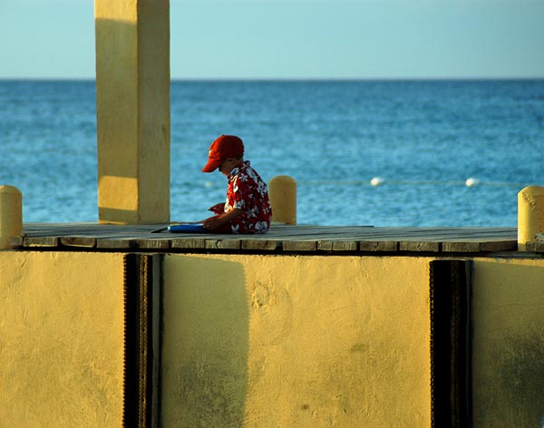 Playing with his LeapPad on the dock at Brisas. Cozumel, Mexico (April 2003)