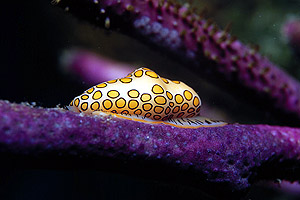 The flamingo tongues were where I had last seen them, at 17 feet depth around the cable. There was also an arrow crab under the phone cable in that area, and a juvenile spotted drum as well. In the deeper portions of the dive, on the sand flats around 50 feet, we saw a yellow stingray, a southern stingray, a reef octopus, and a sleeping puffer. The puffer very obligingly swam into my hands.
