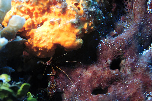 An arrow crab hides between two sponges