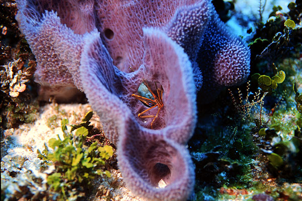 An arrow crab rests in an azure vase sponge, along with a sea pearl.