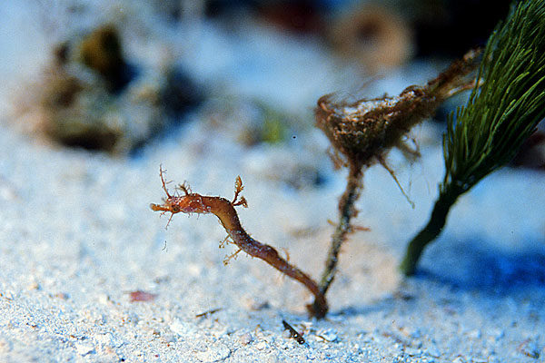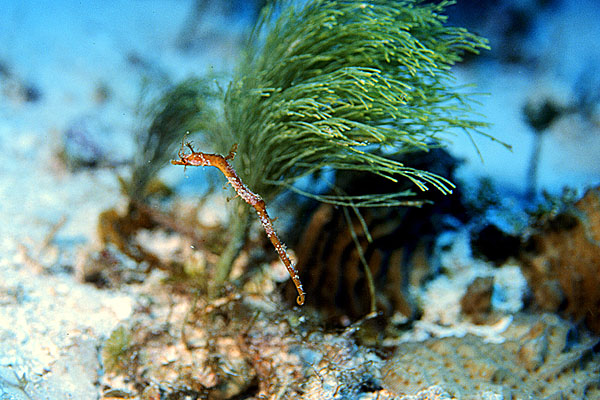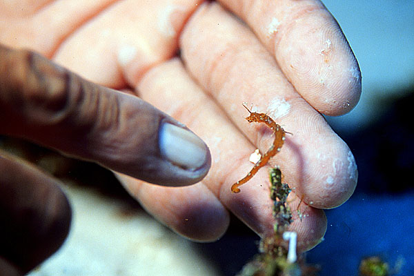 a pipefish (our first) in of the sand chutes! Very small, skinny, with red bands.