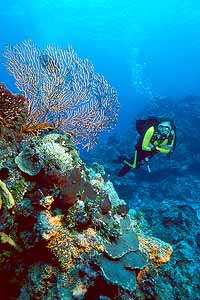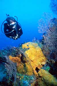 the main subject. In the middle photo, the diver and the sponge & fan reef
