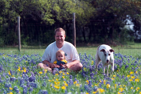 Dave, Dylan and Butler in the backyard bluebonnets (4/01)
