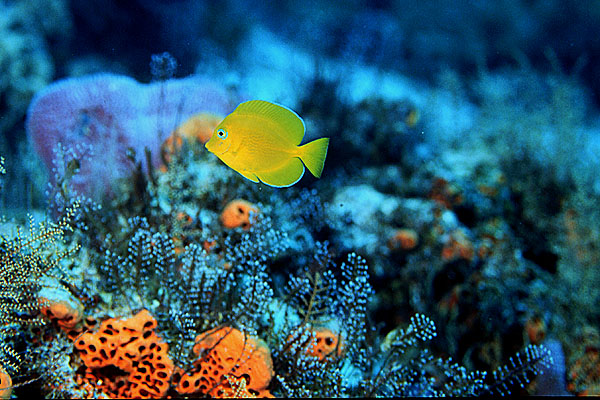 A juvenile yellowtail damselfish pauses long just enough for me to trigger the shutter.